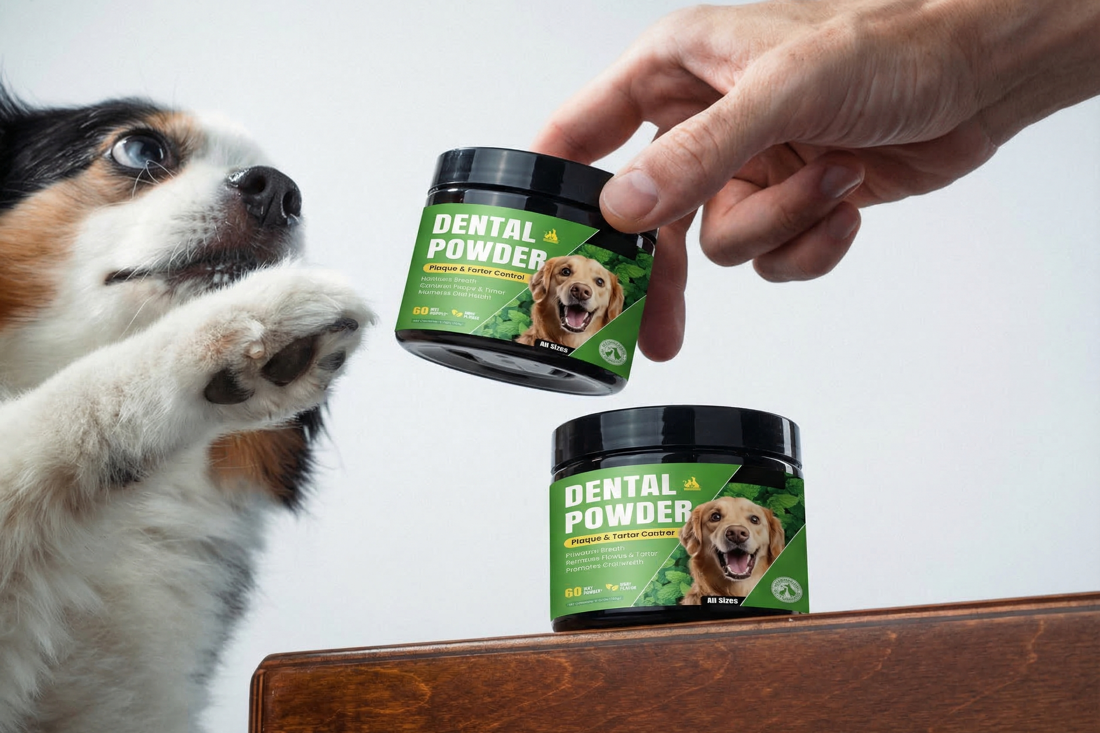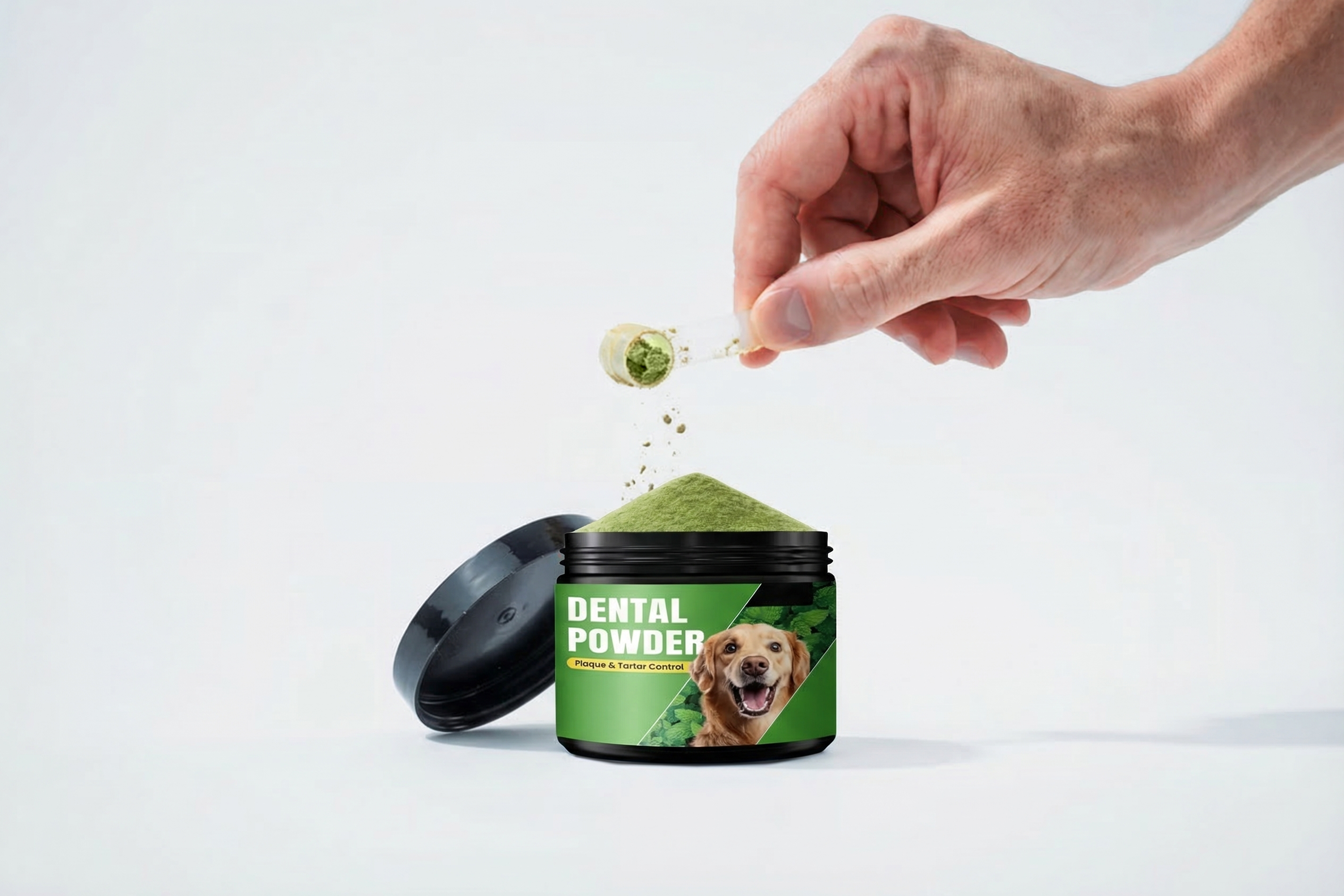 Administering our dental powder is incredibly simple. Just sprinkle the recommended dose onto your dog's regular food. Because it contains no harsh chemicals or artificial flavors, most dogs enjoy the taste or don't even notice it's there, making it the perfect stress-free solution for even the pickiest eaters.